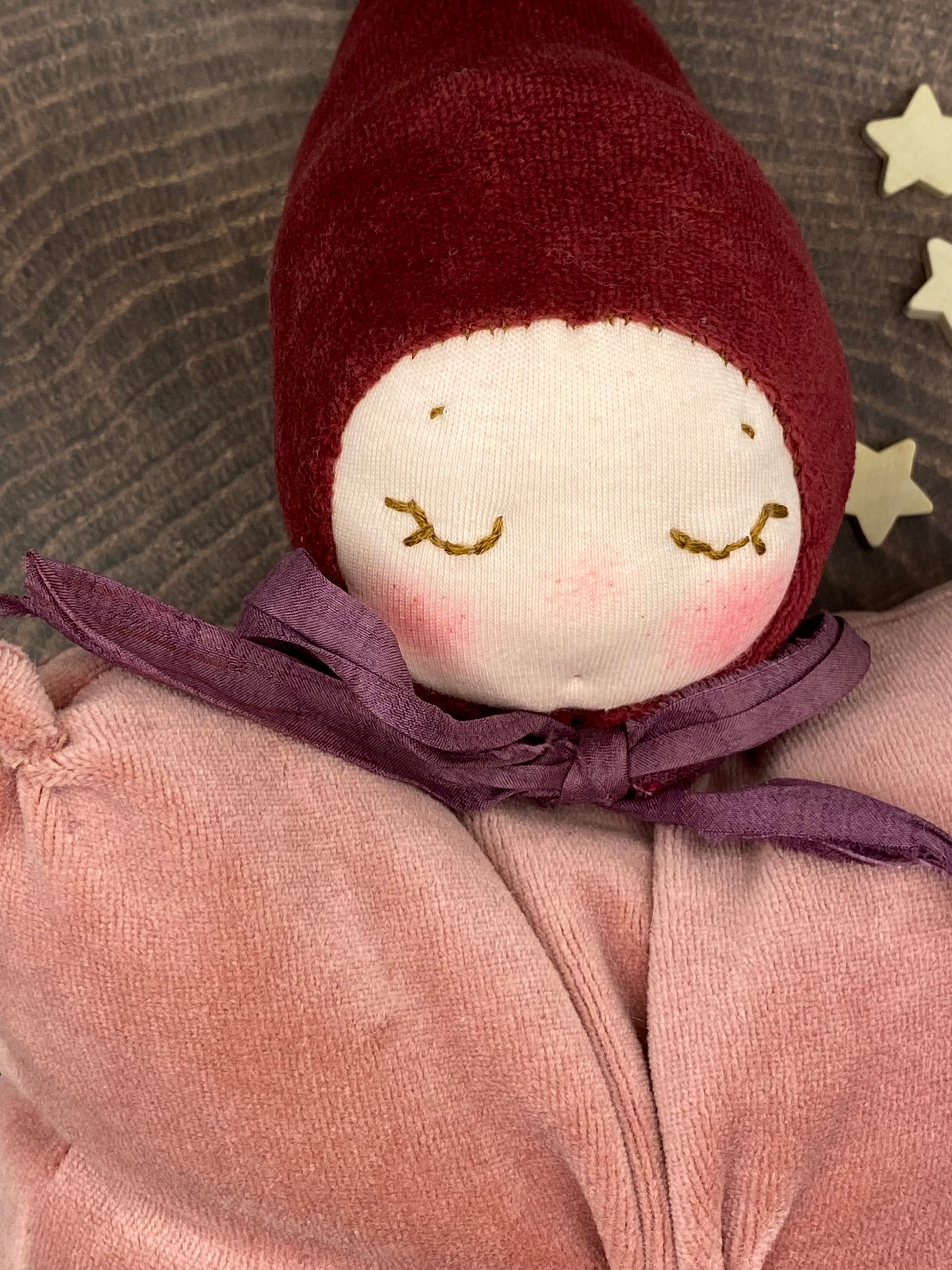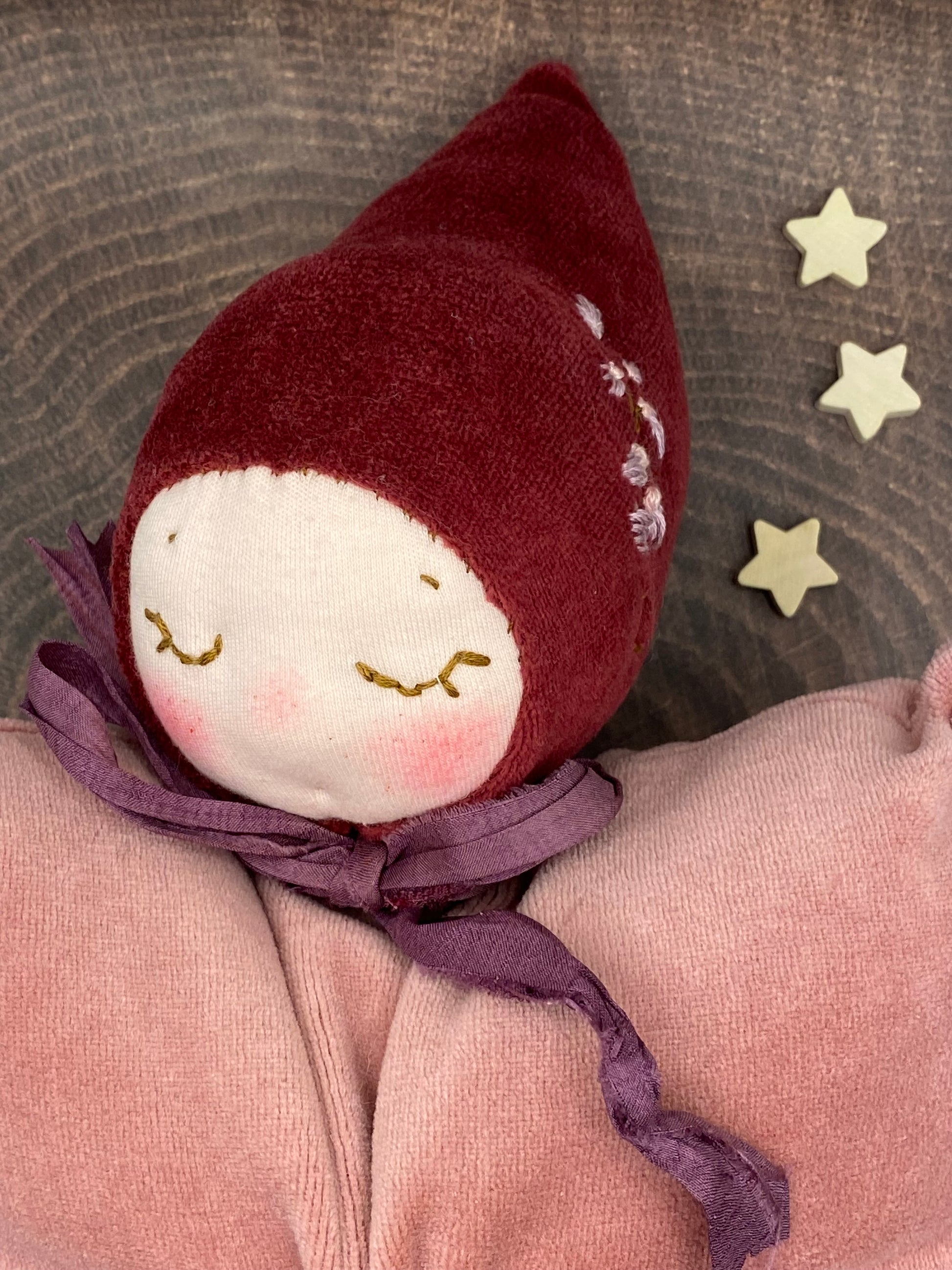 Her pixie hat is lovingly hand-embroidered, made of soft cotton velour, and filled with wool just like her body.