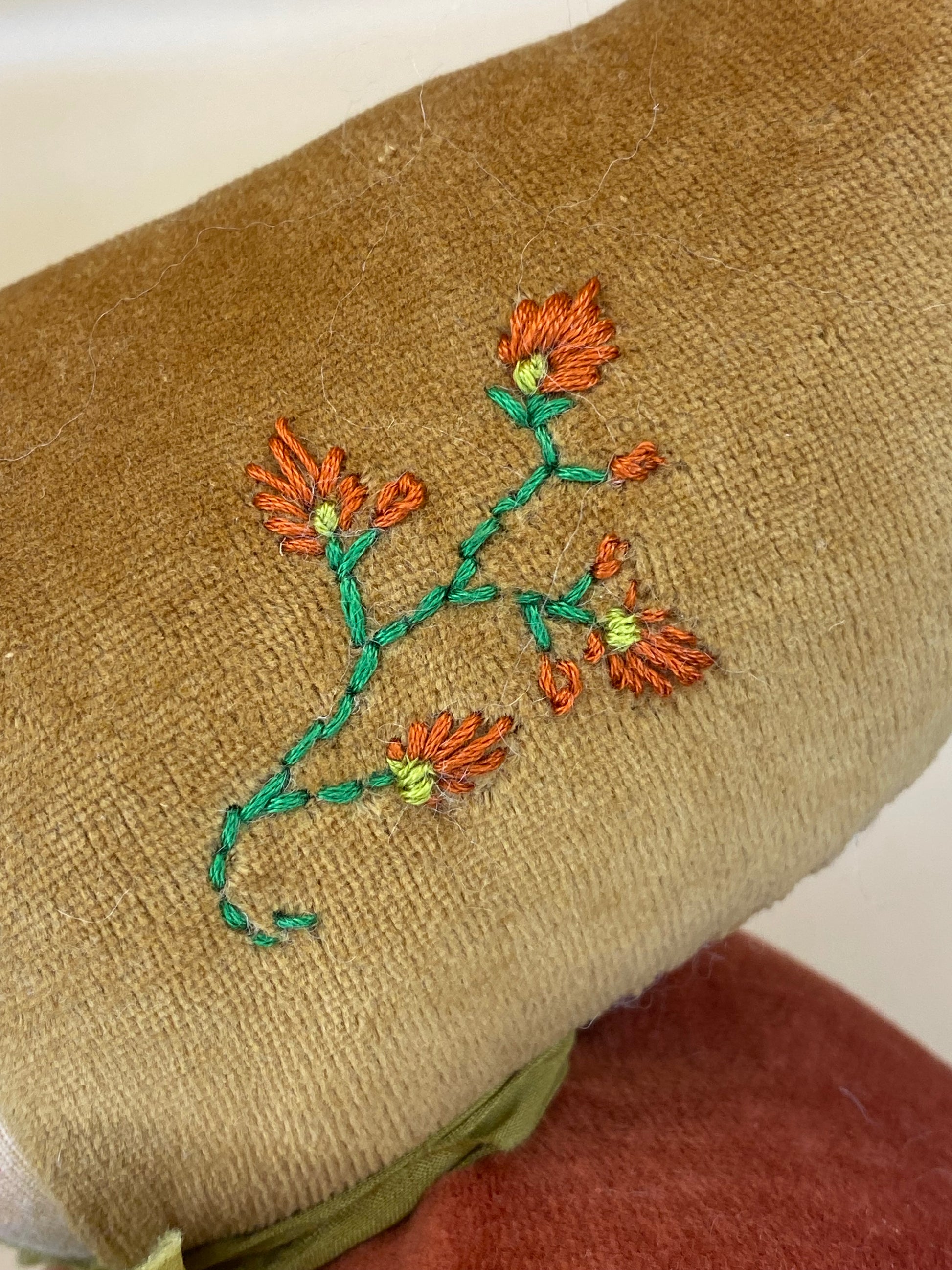 Her pixie hat is lovingly hand-embroidered, made of soft cotton velour, and filled with wool just like her body.